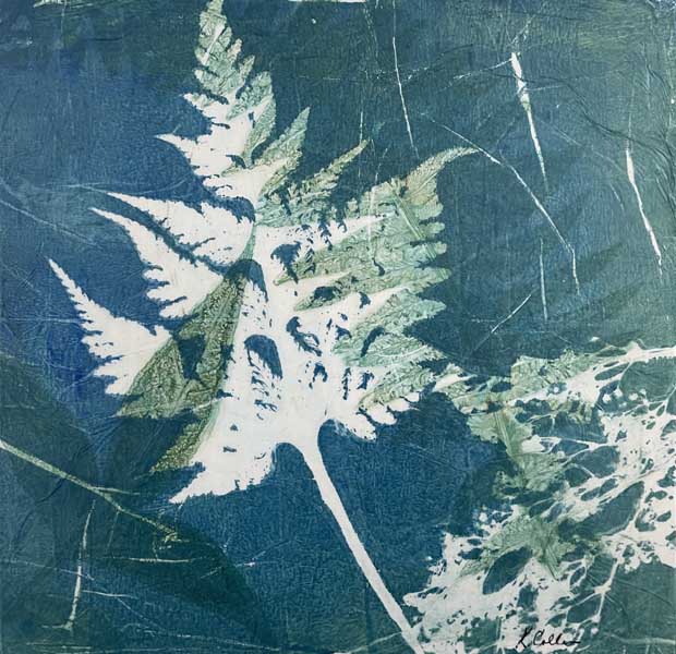 Monoprint collage with woodfern, pecan leaf, baby's breath, and boston fern on panel