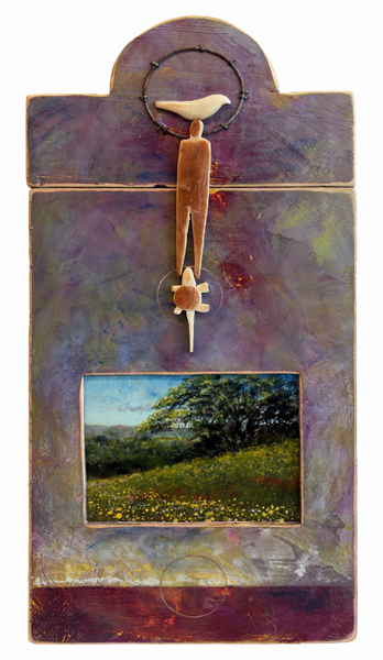 Acrylic, relief sculpture, & found objects on wood panel