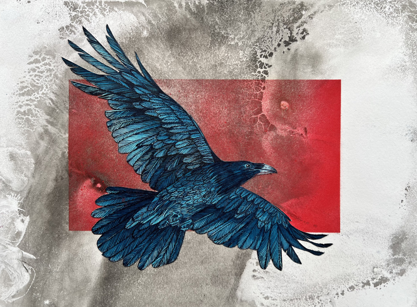 Acrylic, ink, spray paint, & smoked paper collaged on wood
