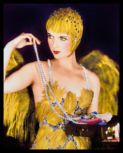 Early in 2013, a brilliant friend and client suggested to Susan that she begin making art prints for sale, specifically images of women from the 1910s and 1920s who made their names onstage and in very early films. Riley began seeking out black-and-white photos of those women (and men), and then reimagined them in full color, adding embellishments by hand onto the print surface to make them even more realistic.